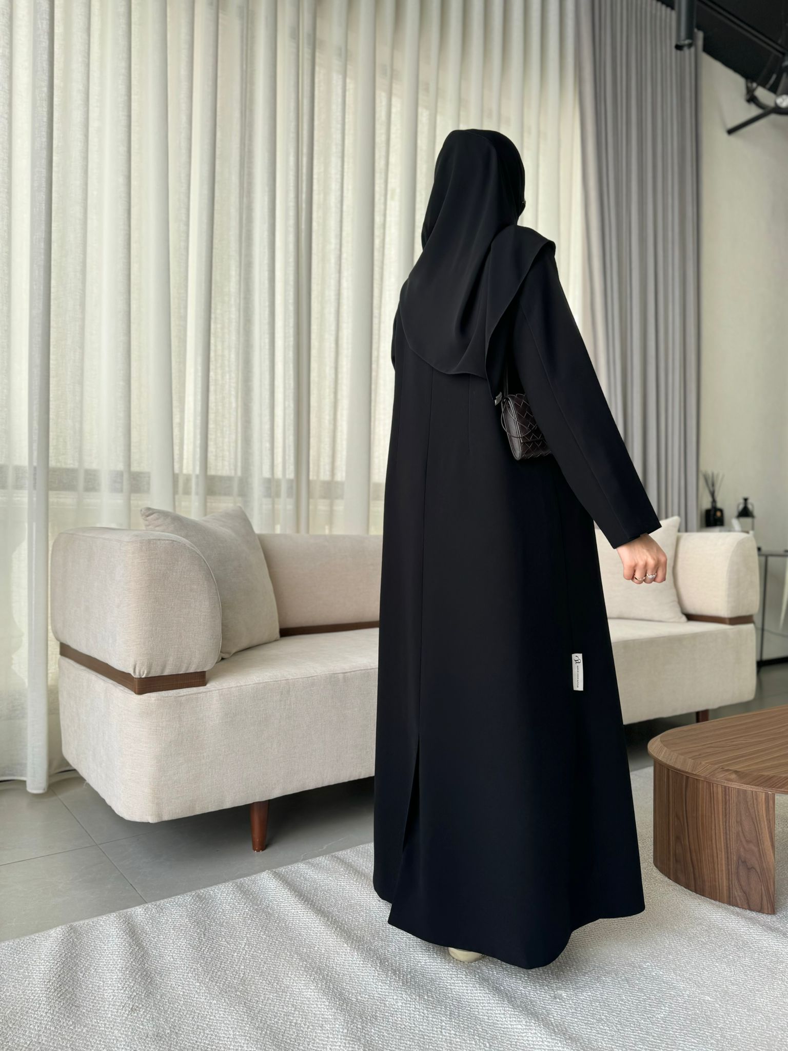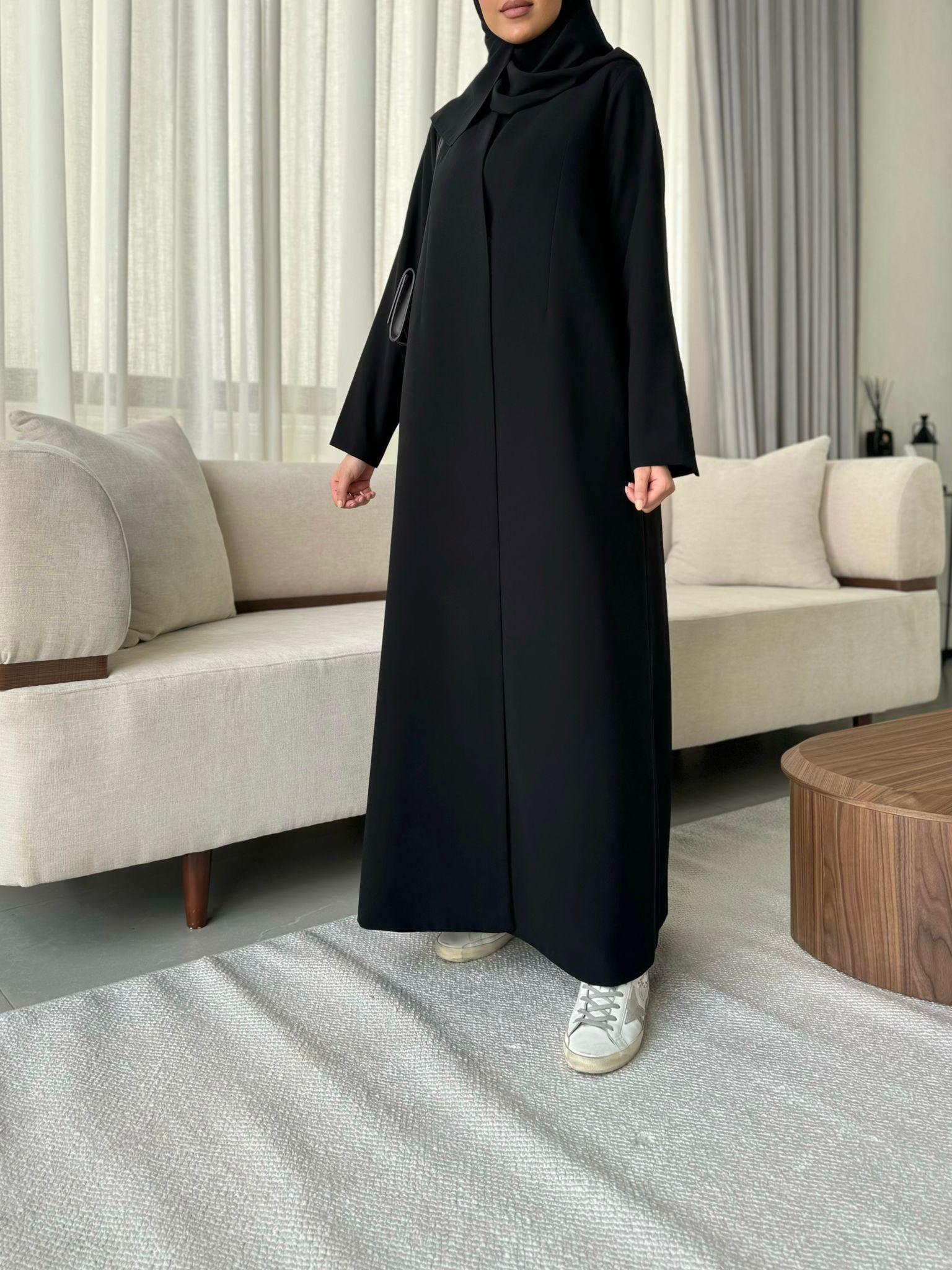 عباية ستايل بليزر بياقة سادة وقصتها سيدة مو كلوش ومبطنة بالكامل وفيها طباقي واحد بس