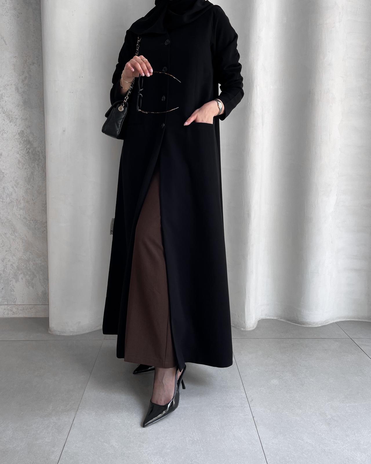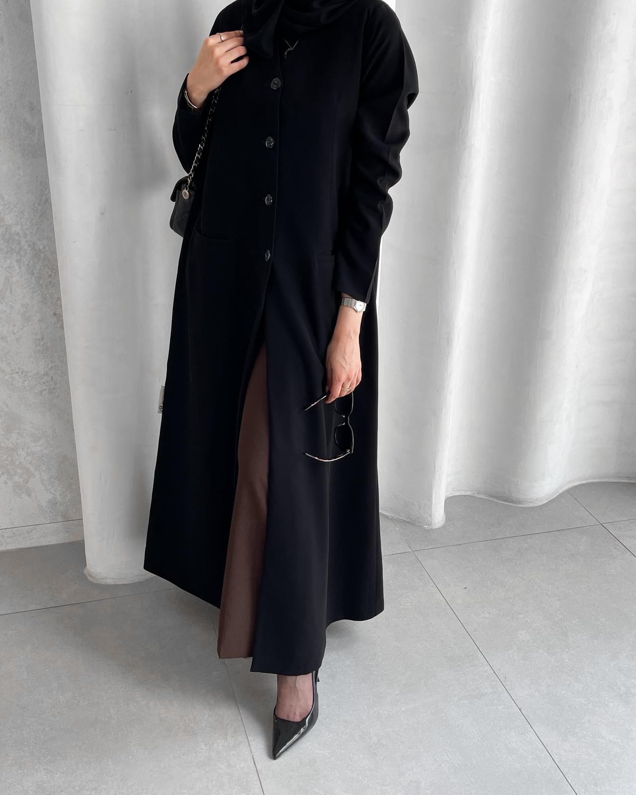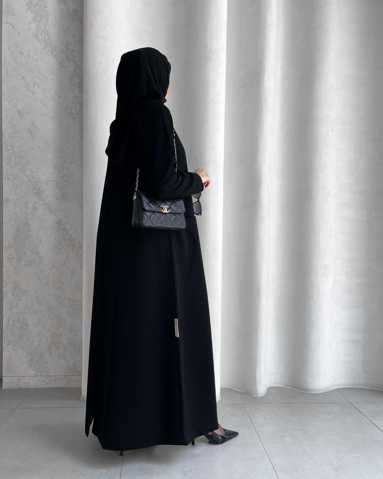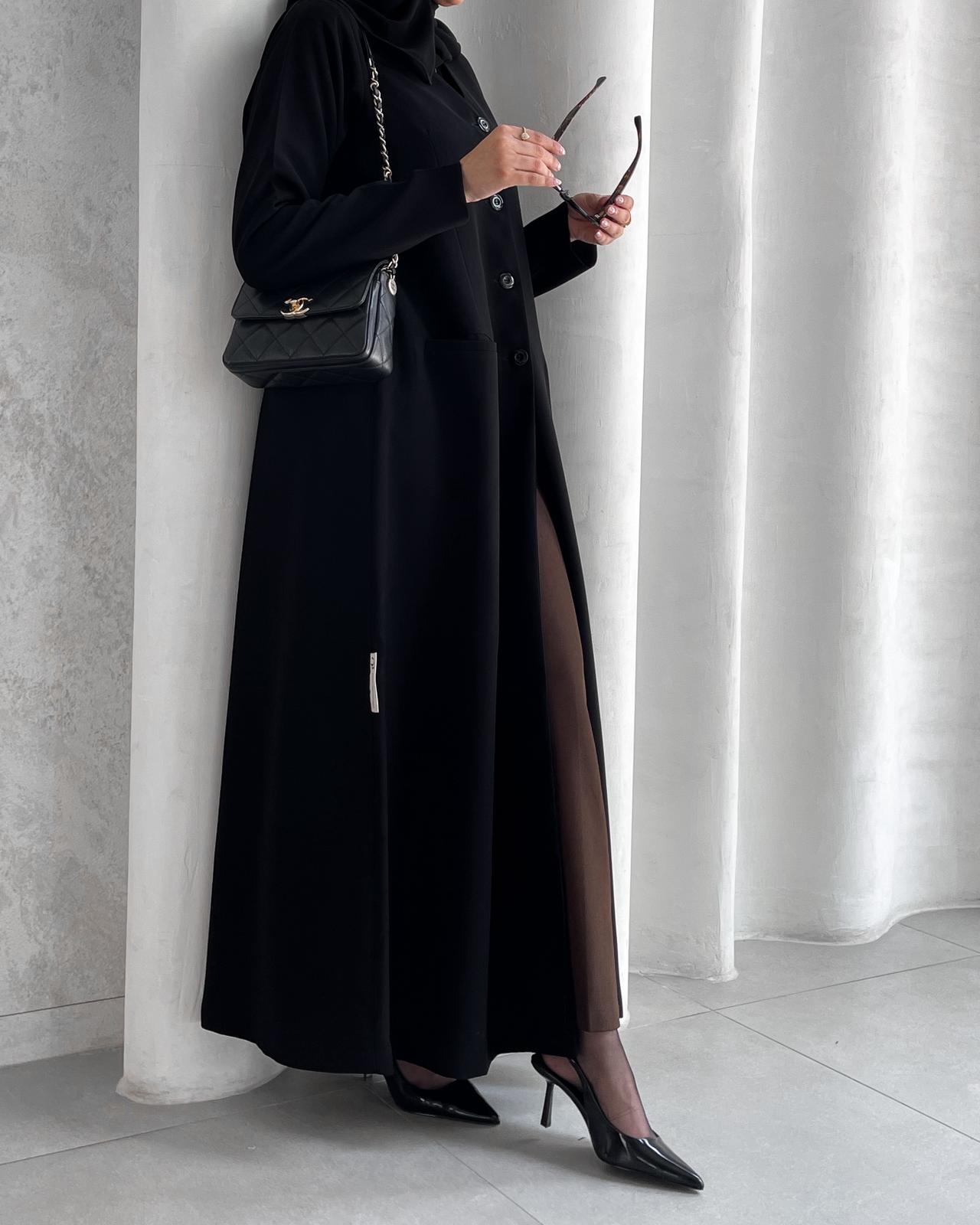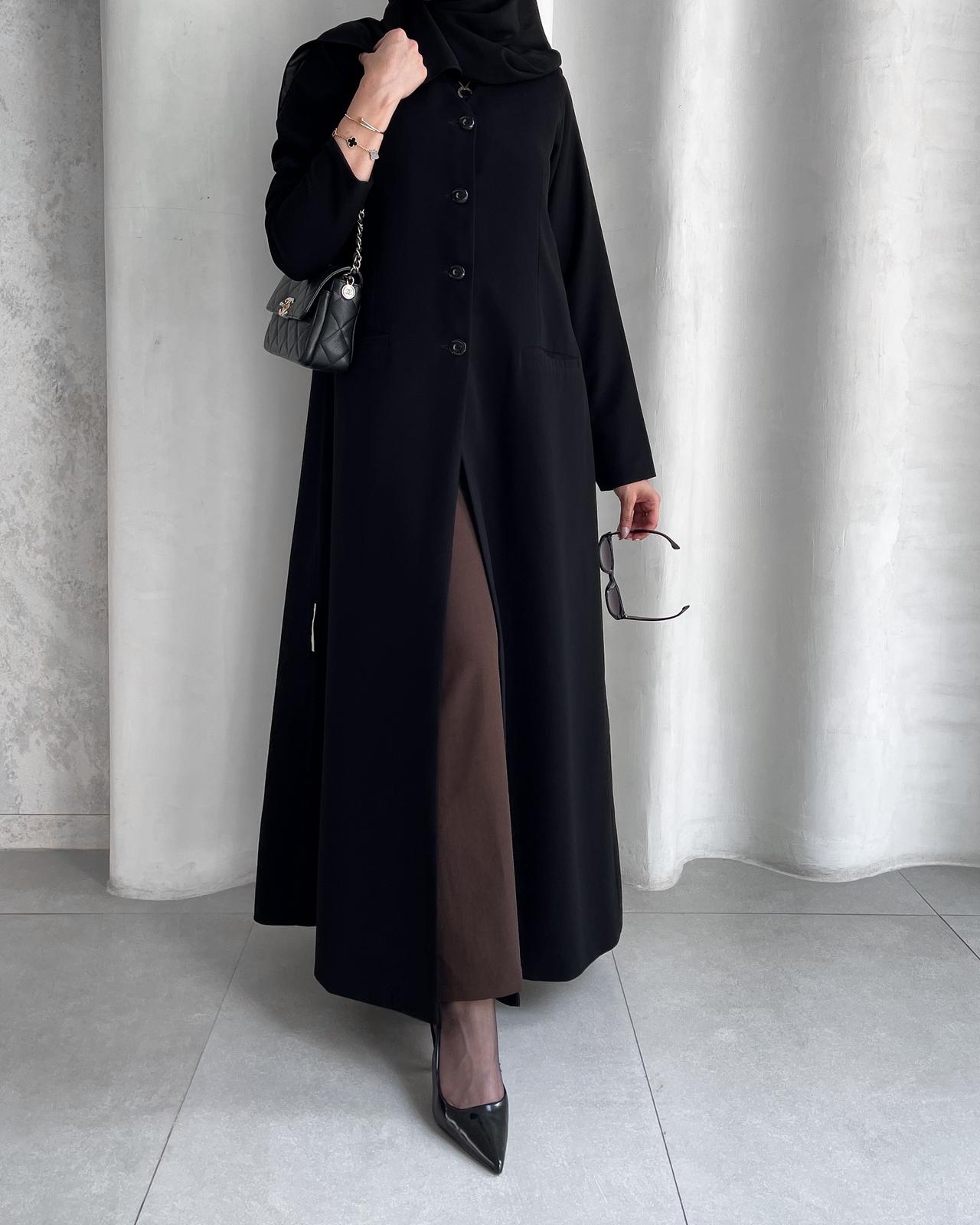 عباية بقصة بليزر بياقة سادة وزراير راقية من جدام وفي مخابي من جدام ( كريب ثقيل مبطن )