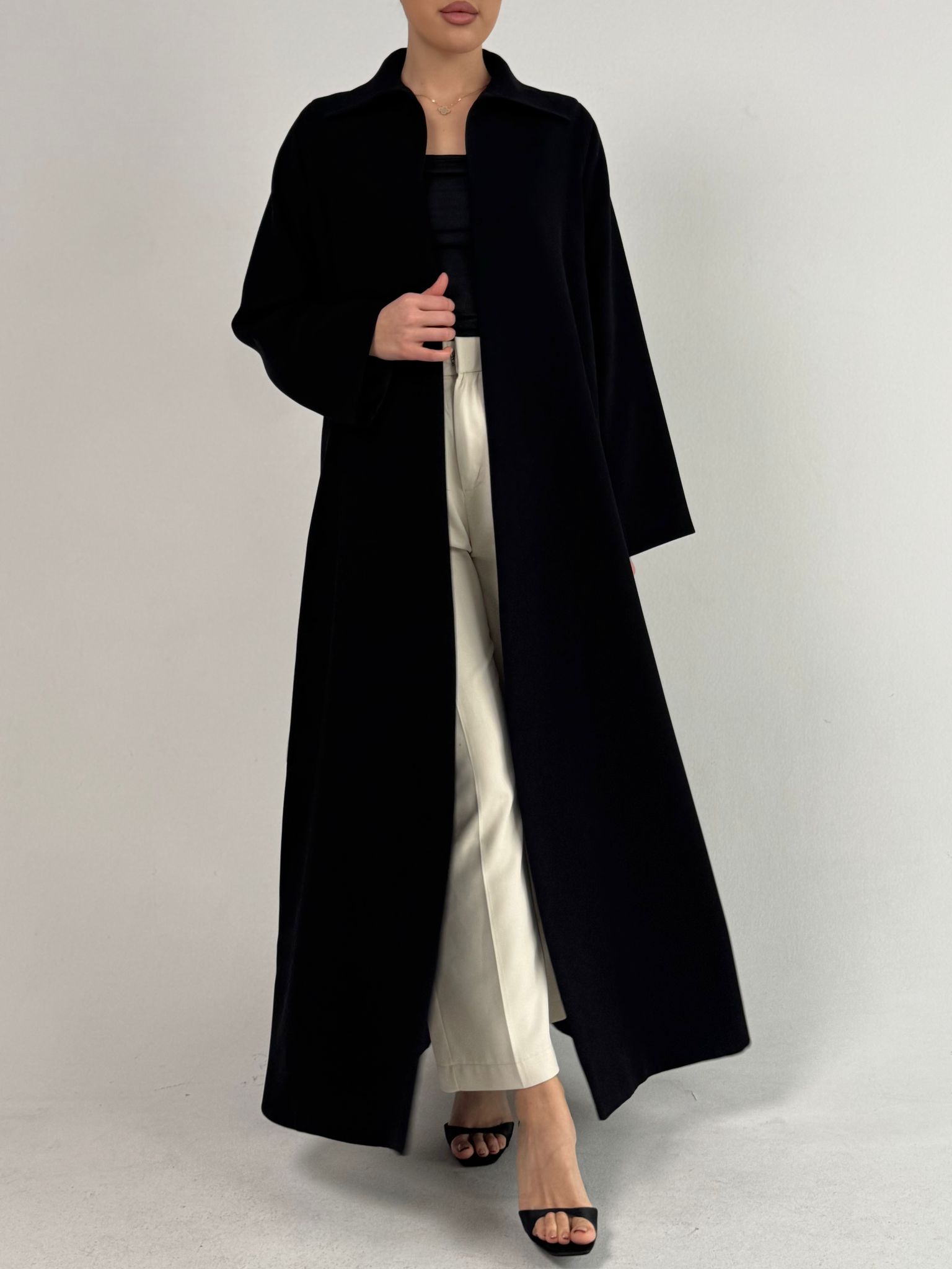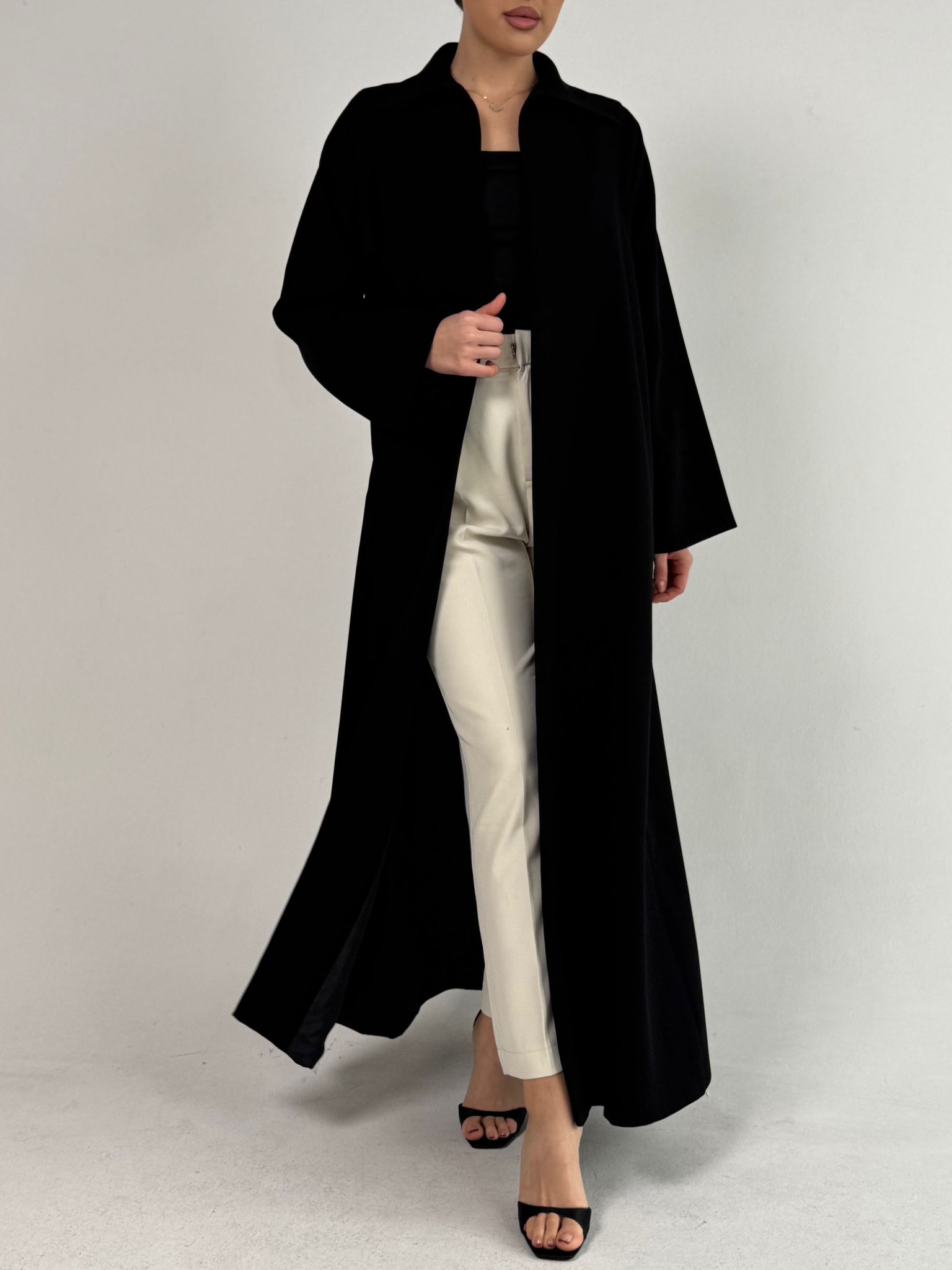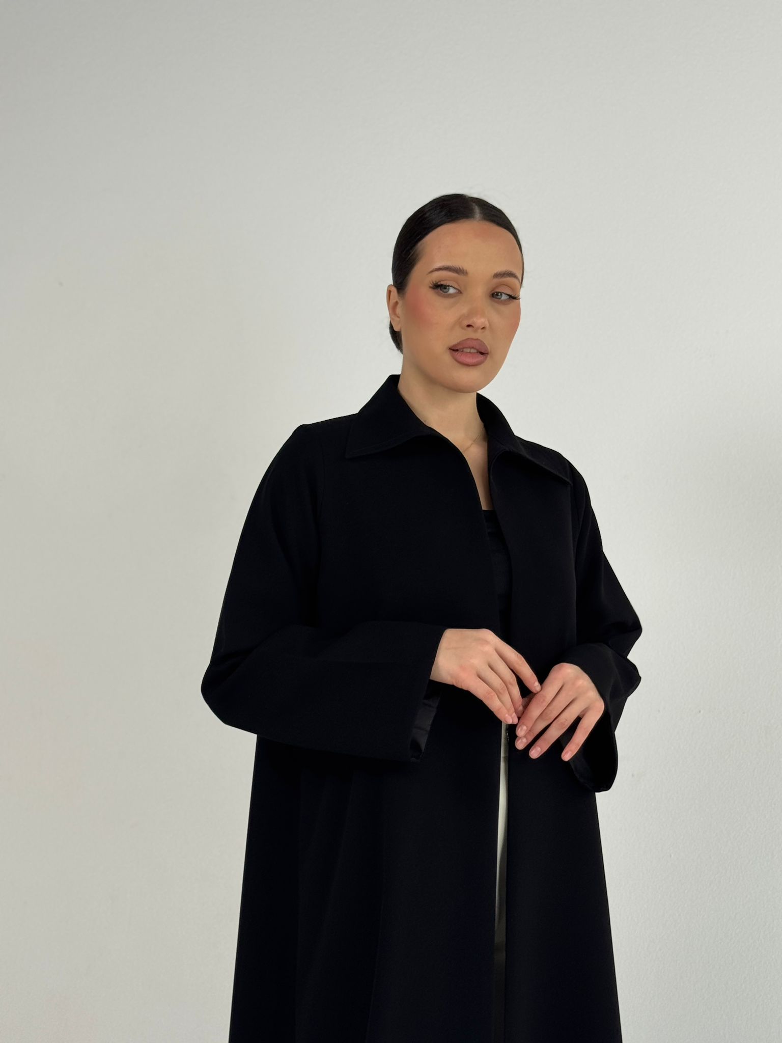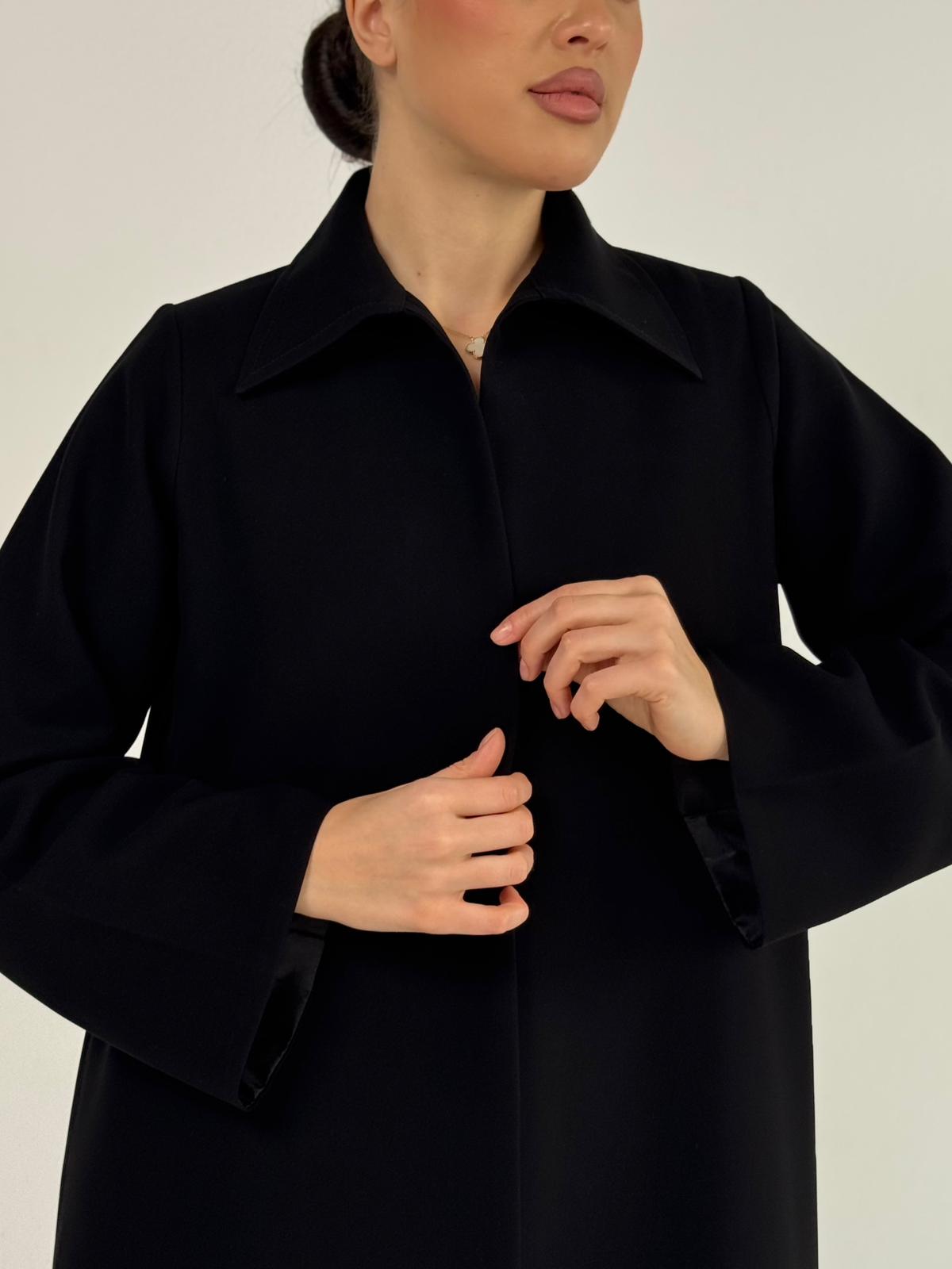 عباية بقصة قميص مفتوحة ومبطنة وفيها فتحة بالخلف