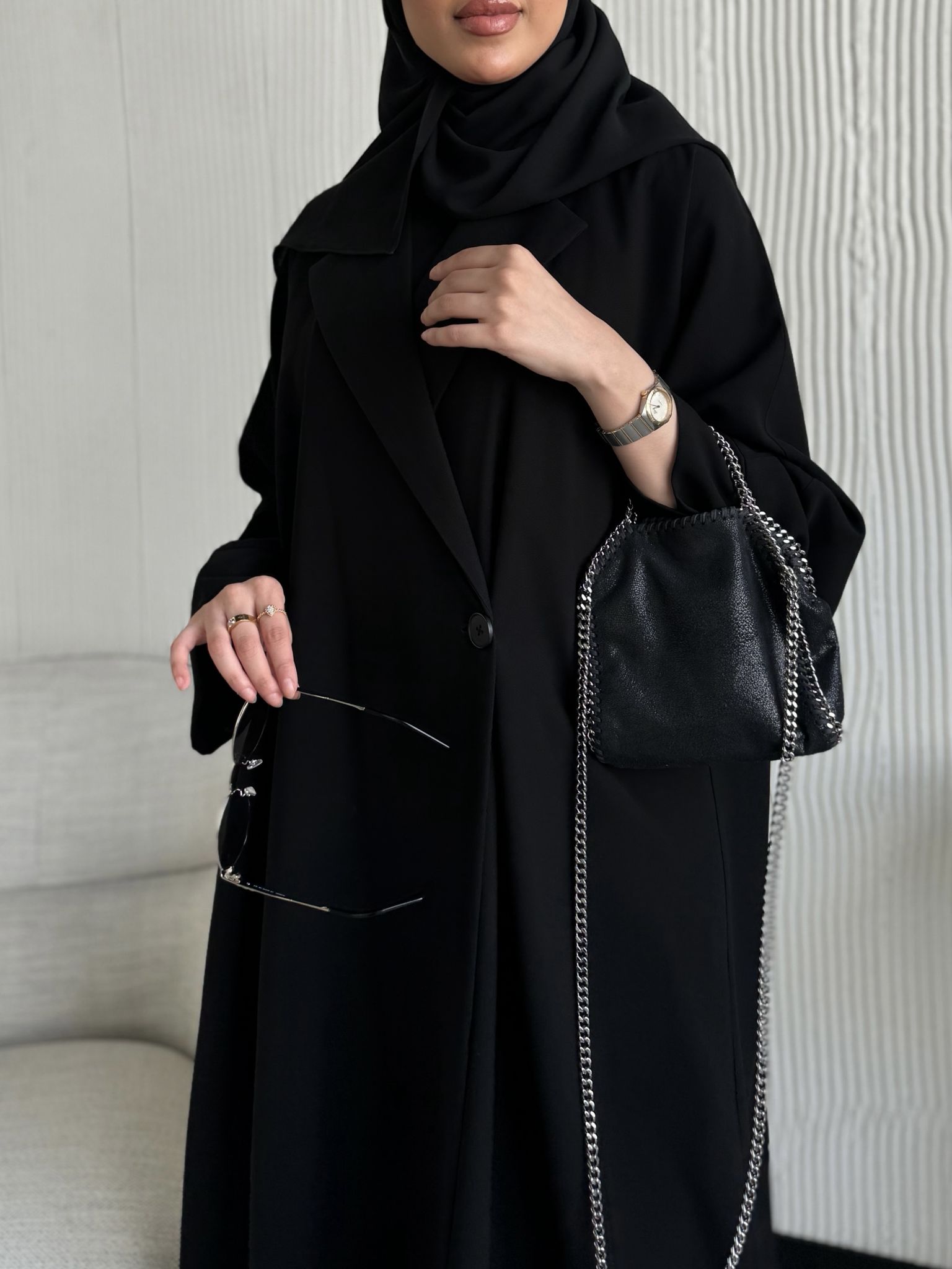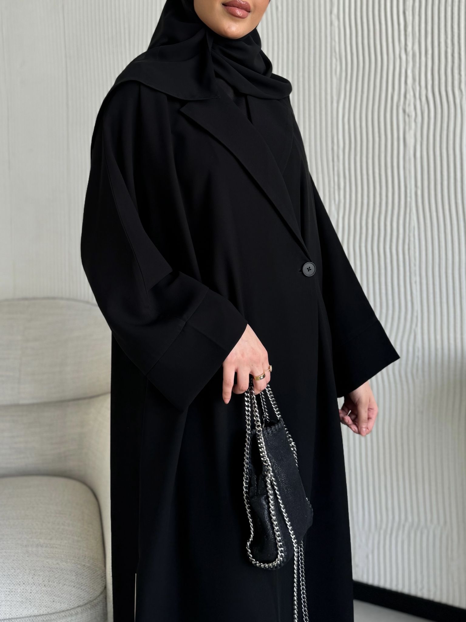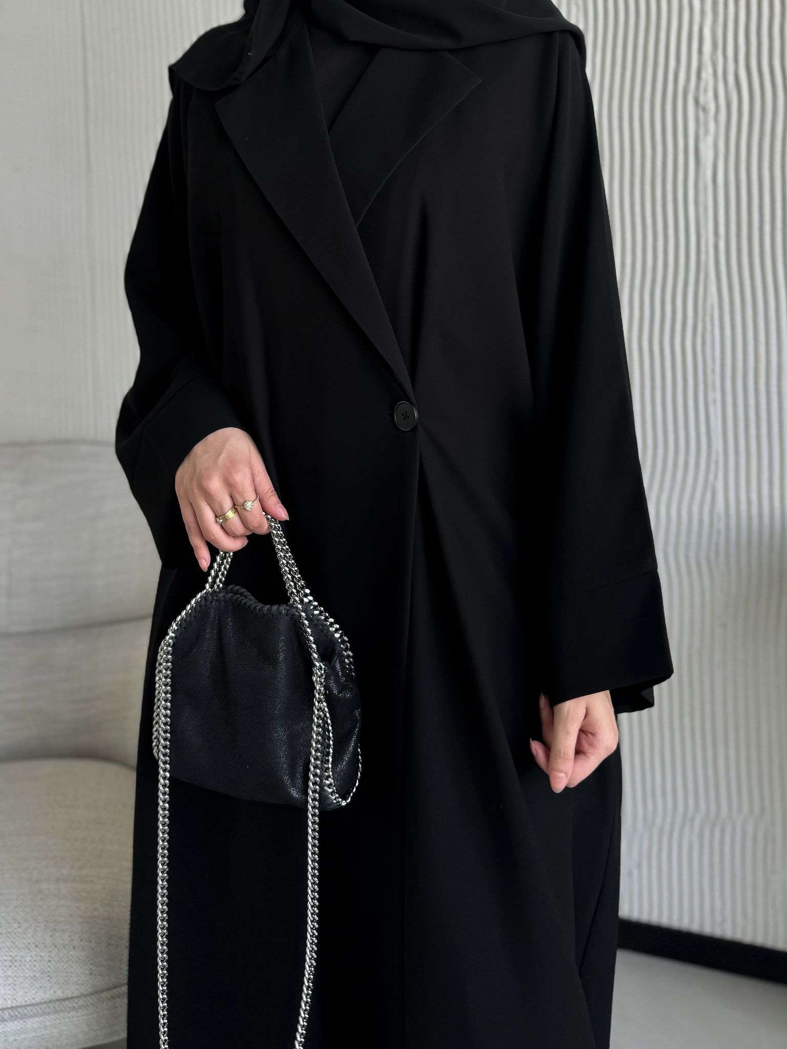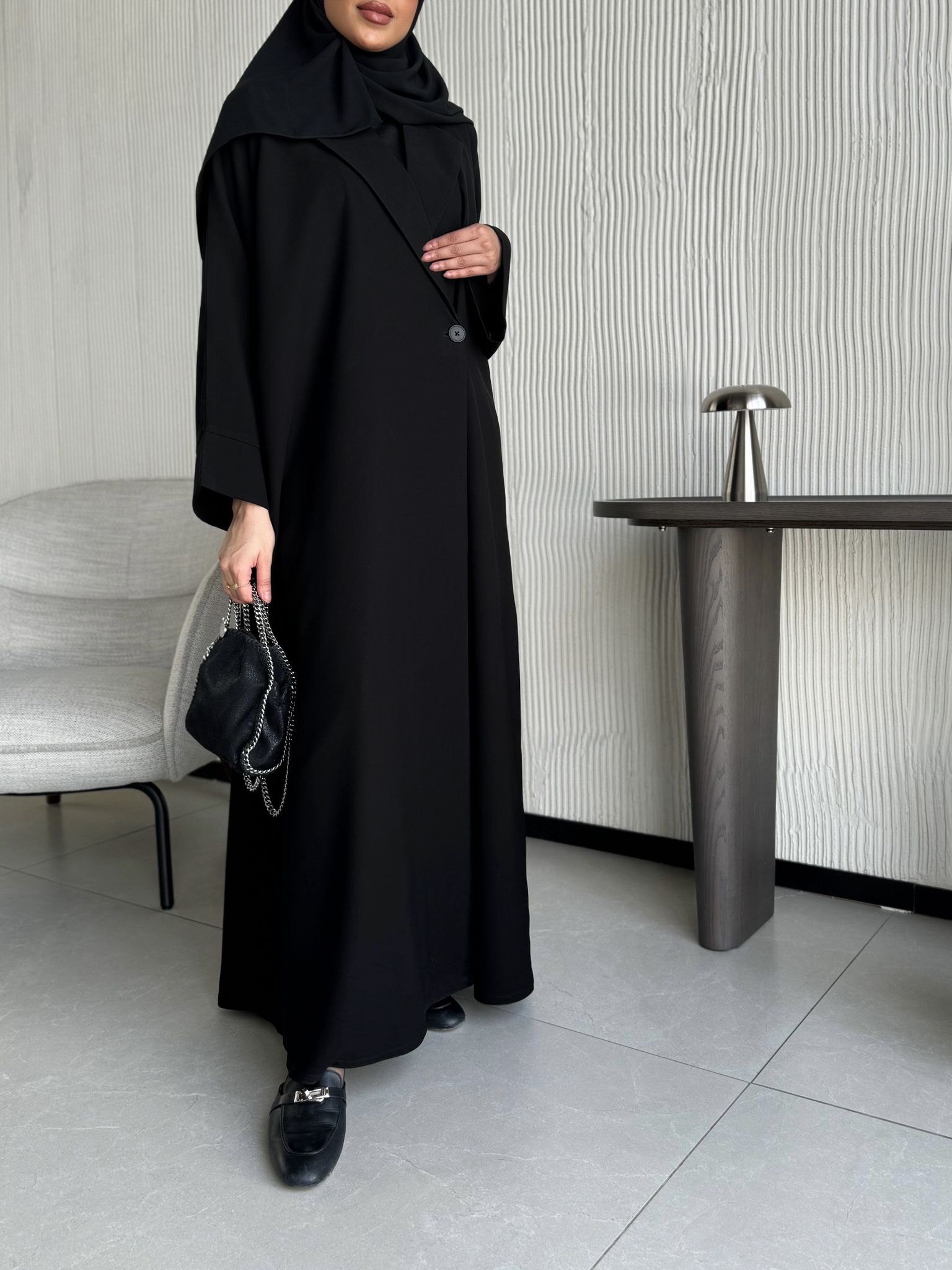 عباية بليزر واسعة قصتها جاينيز واسعة وصايرة لف من داخل بربطة داخلية وخامتها كريب مو مبطنة
