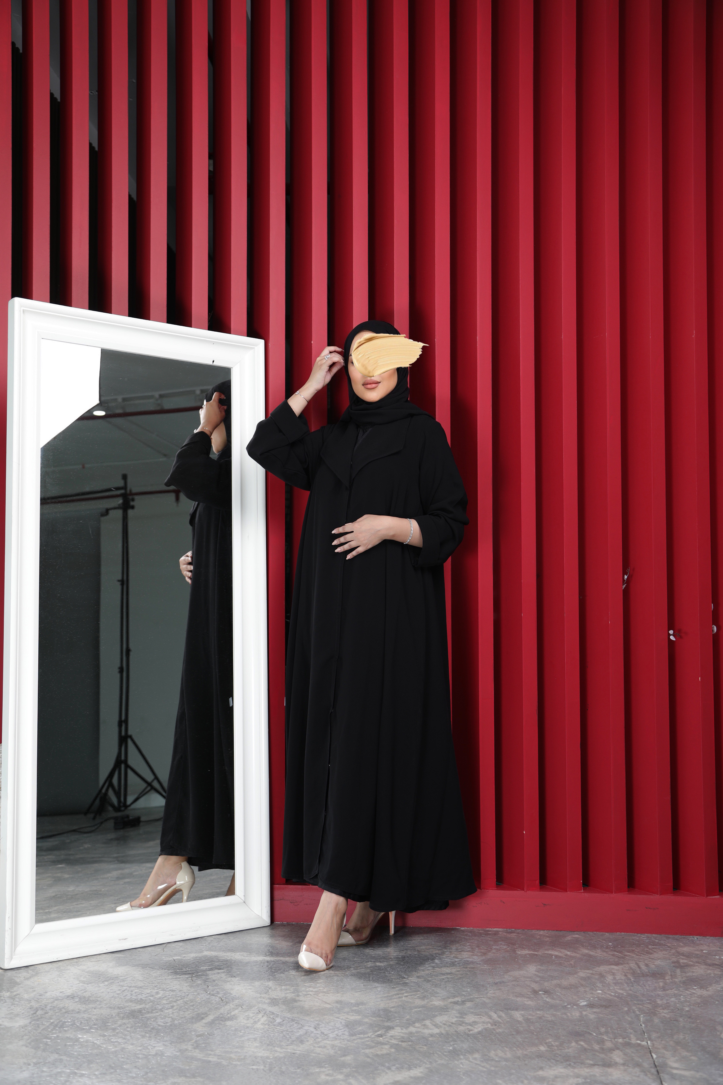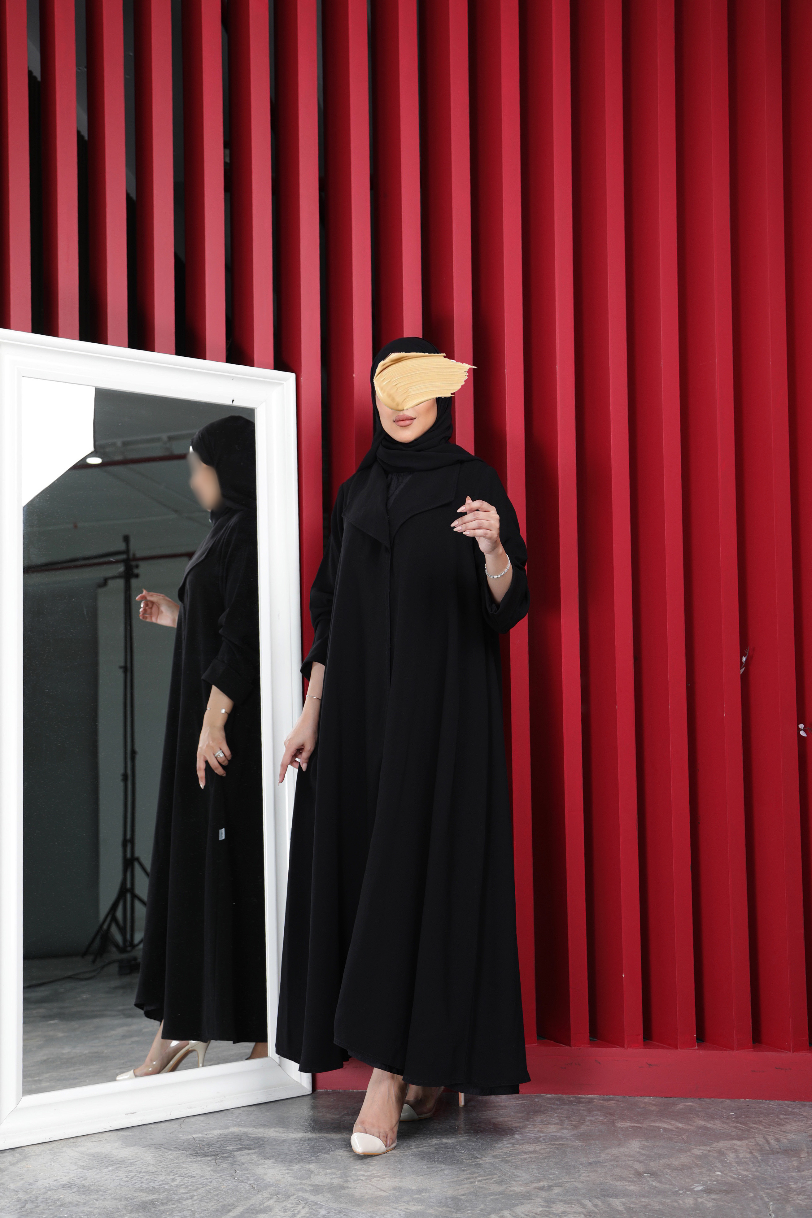 ‎عباية من الخام الكريب بقصة البليزر نص كلوش مع كم جفسه
