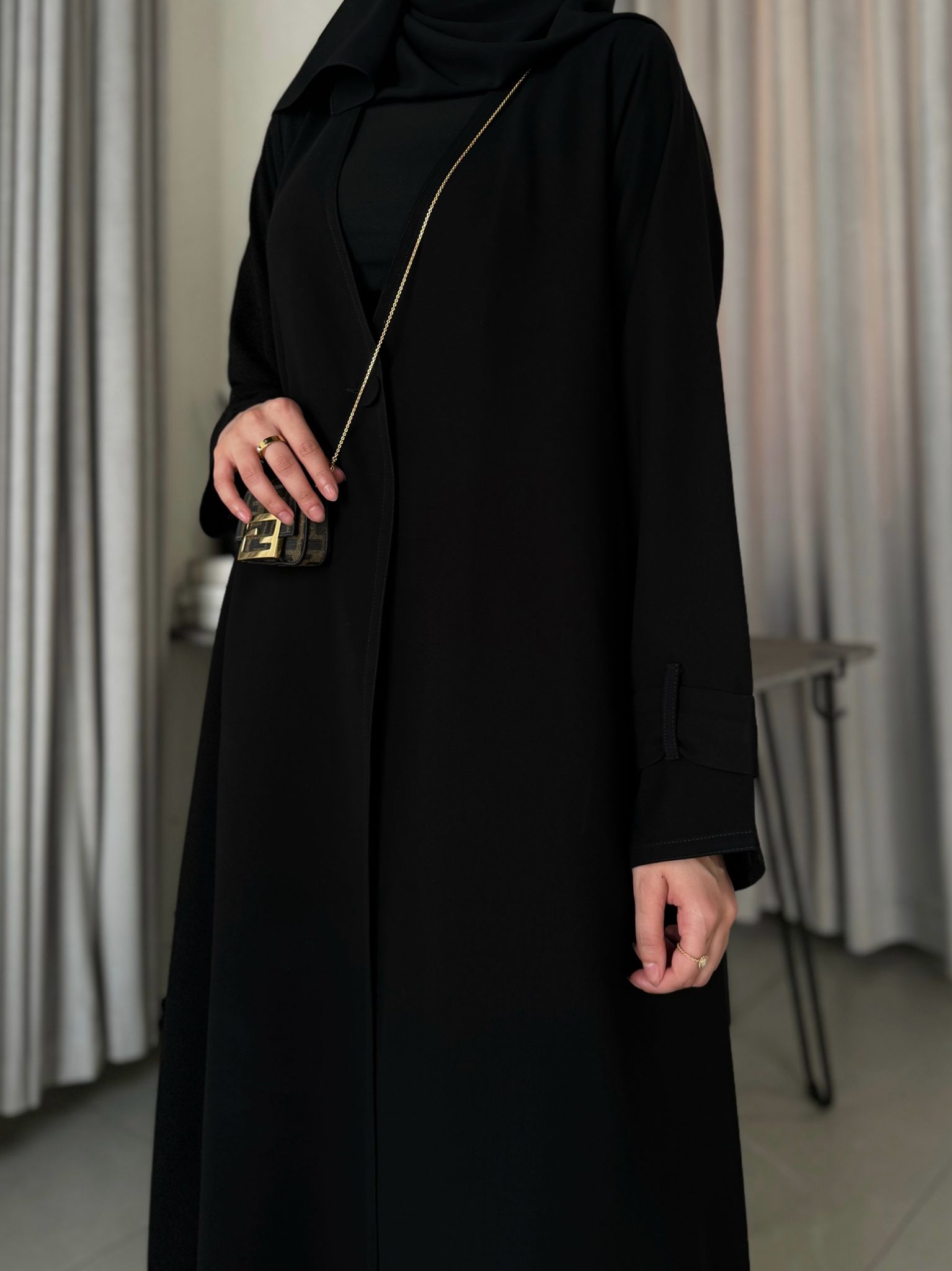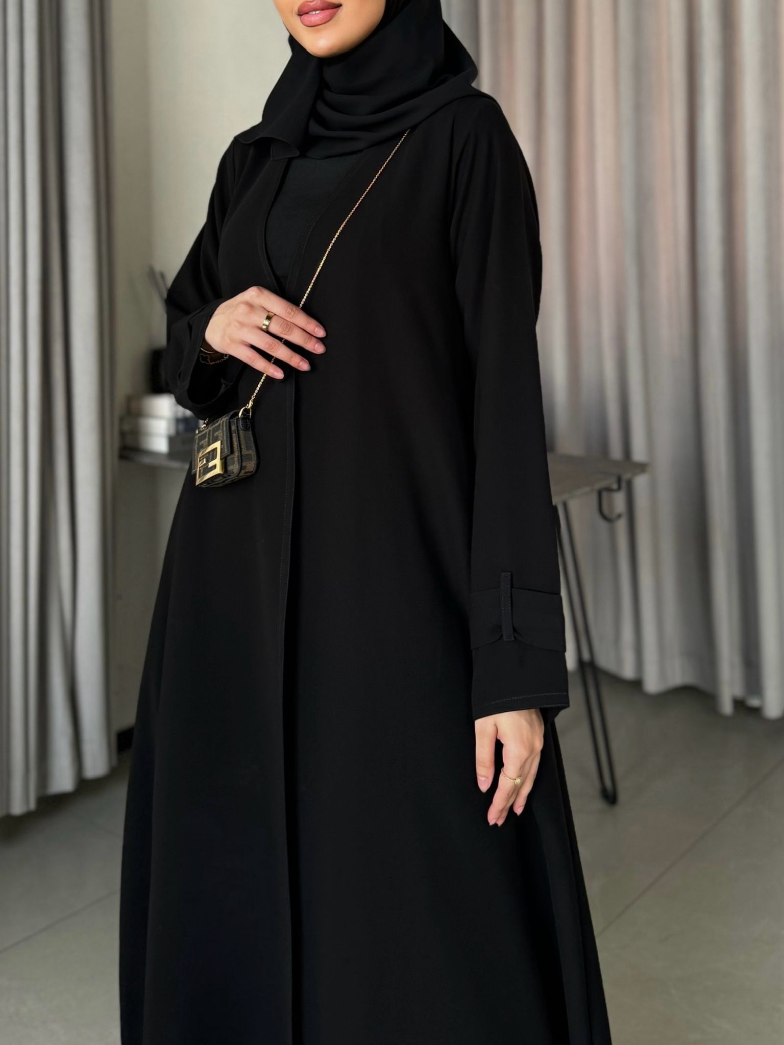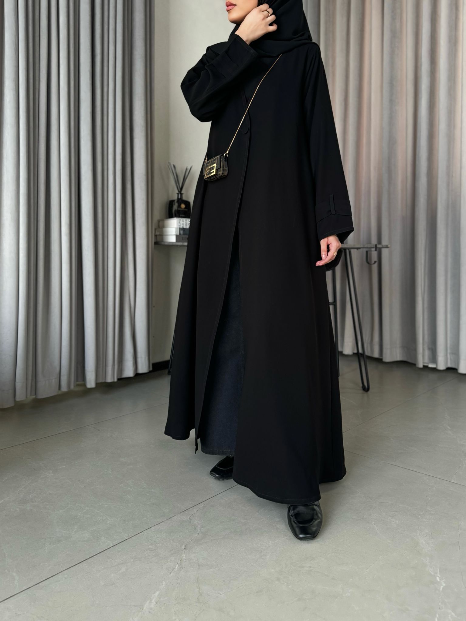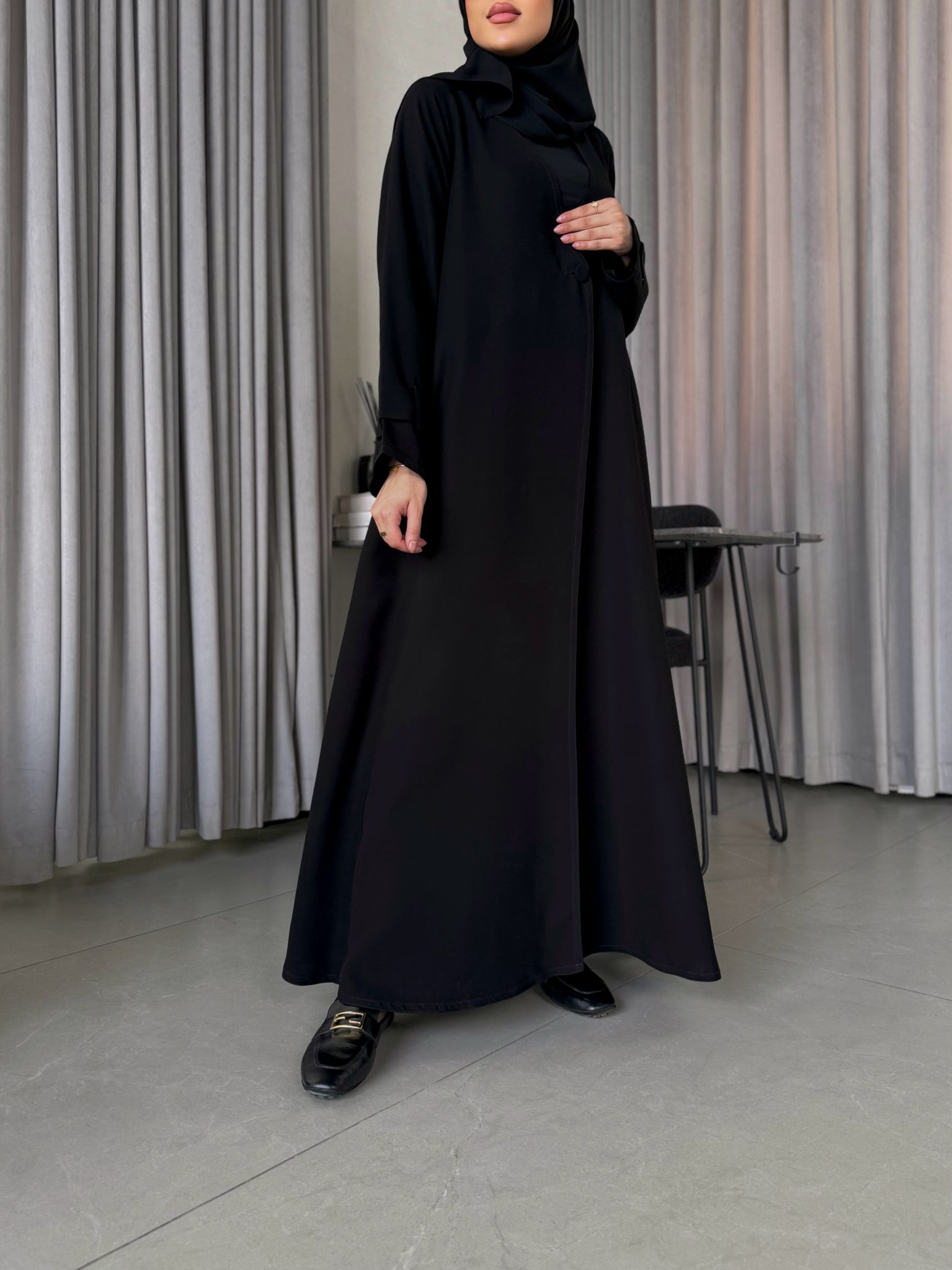 عباية بدون بطانة كلوش قصتها وفيها مخابي جانبية وحركة بسيطة بالكم .
