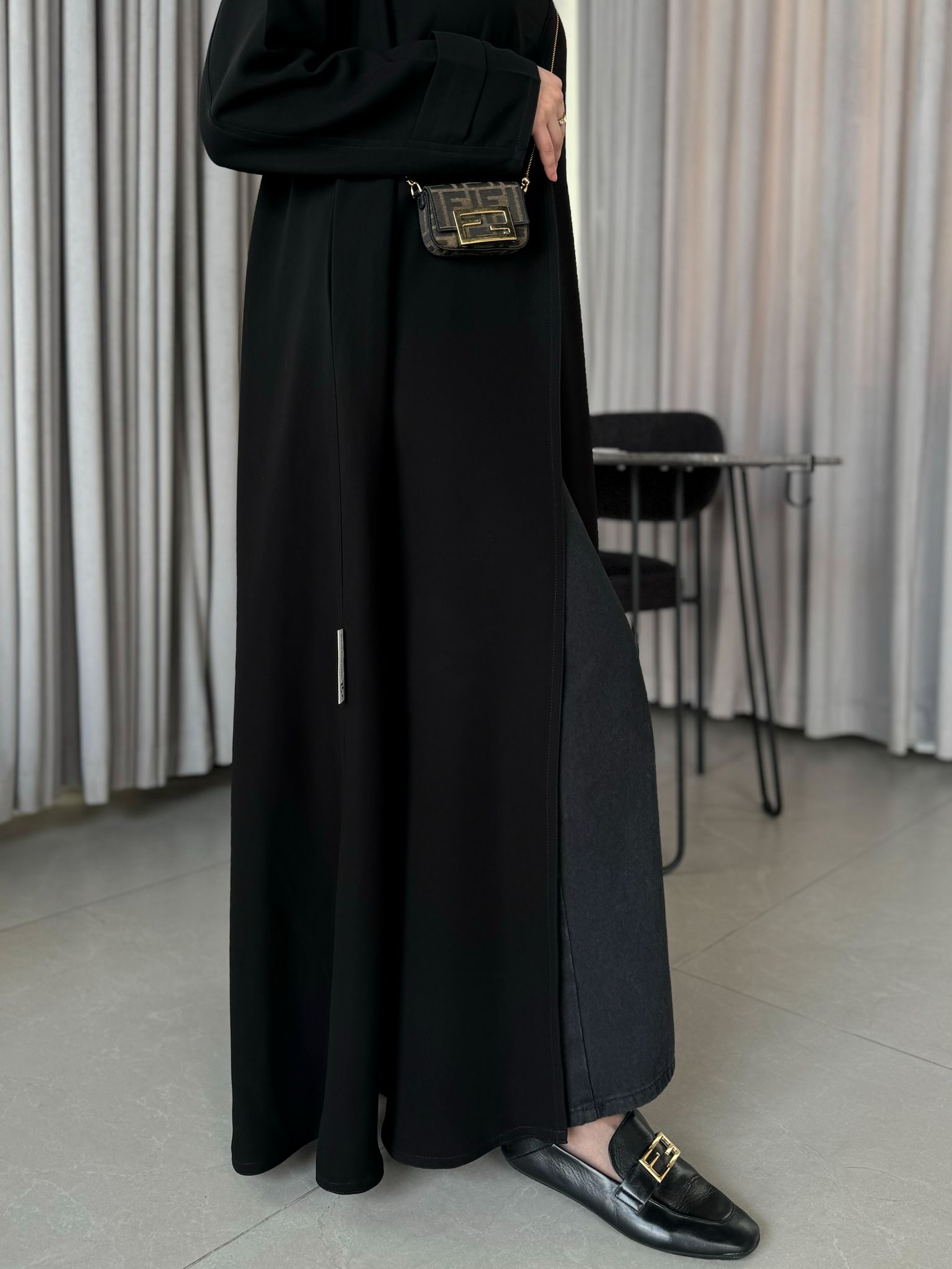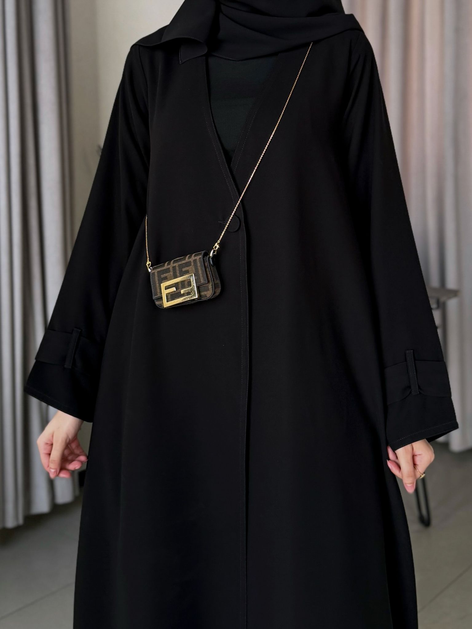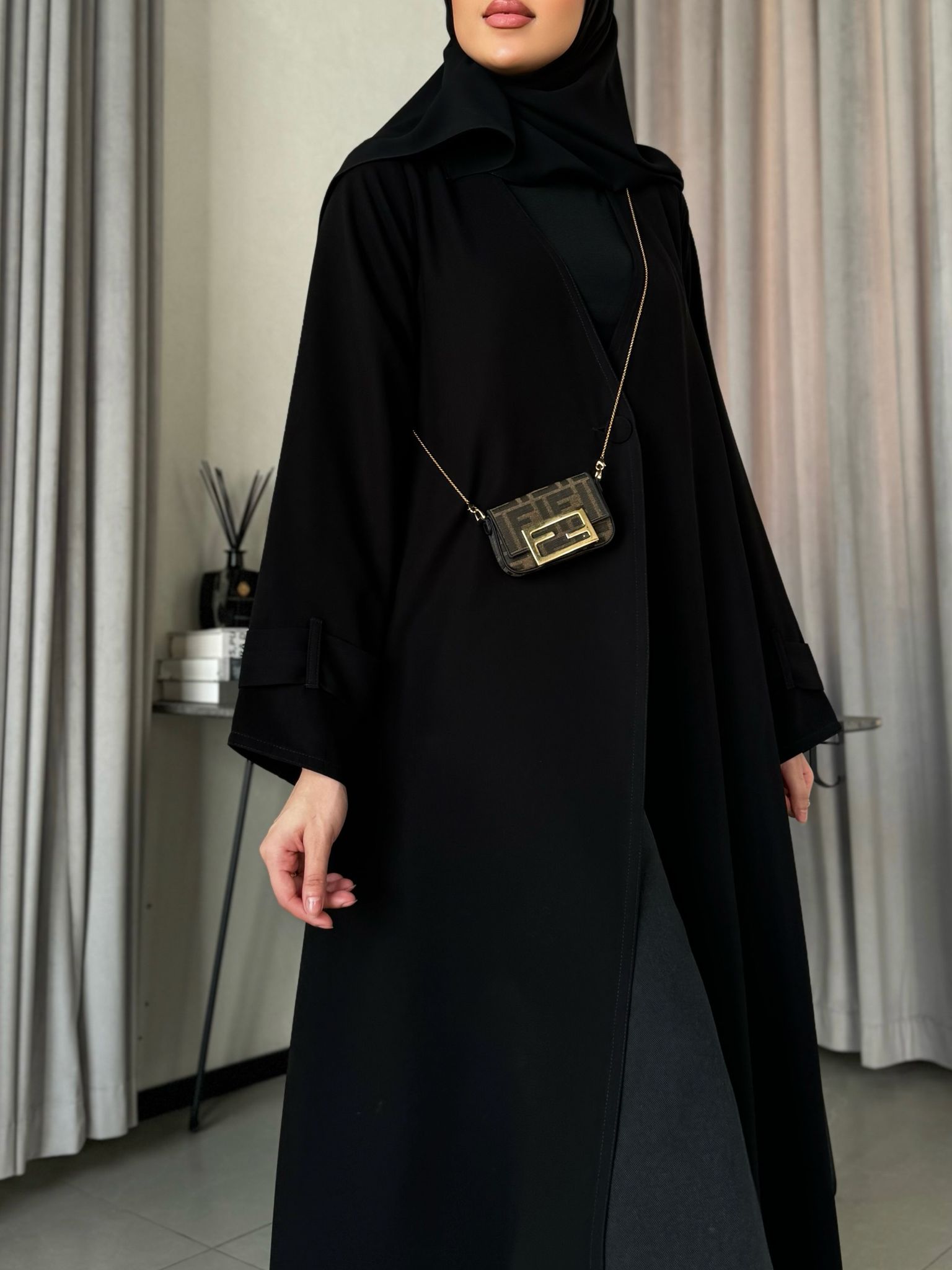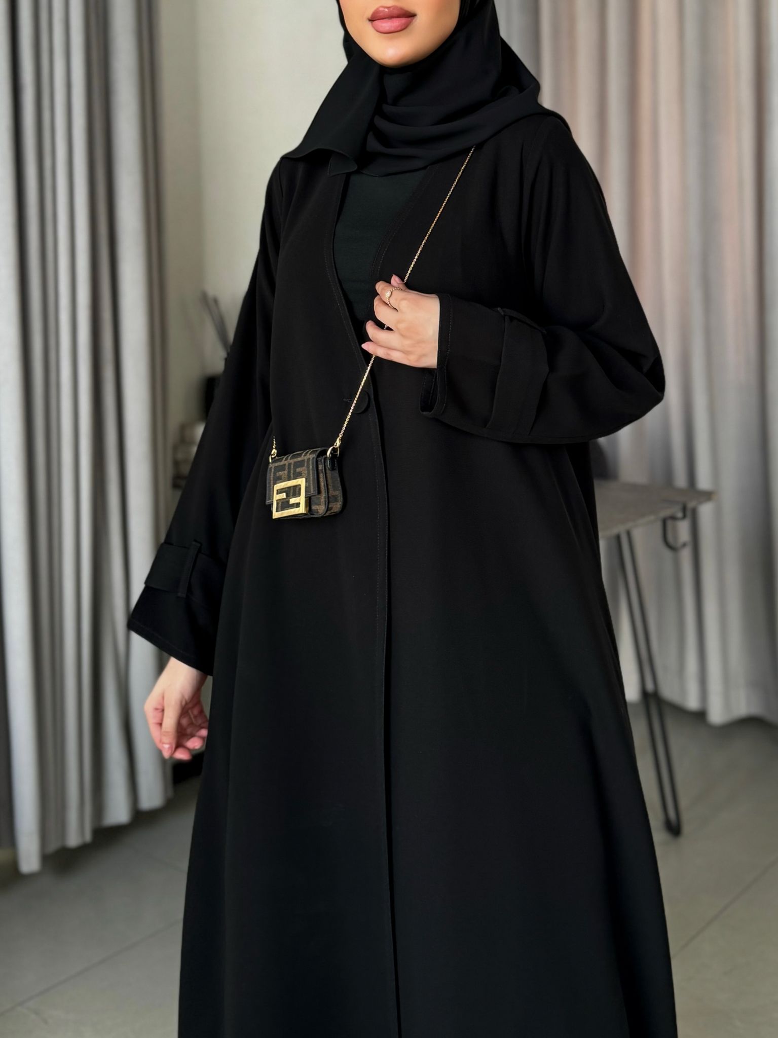 عباية بدون بطانة كلوش قصتها وفيها مخابي جانبية وحركة بسيطة بالكم .