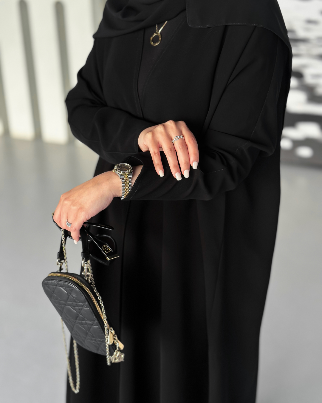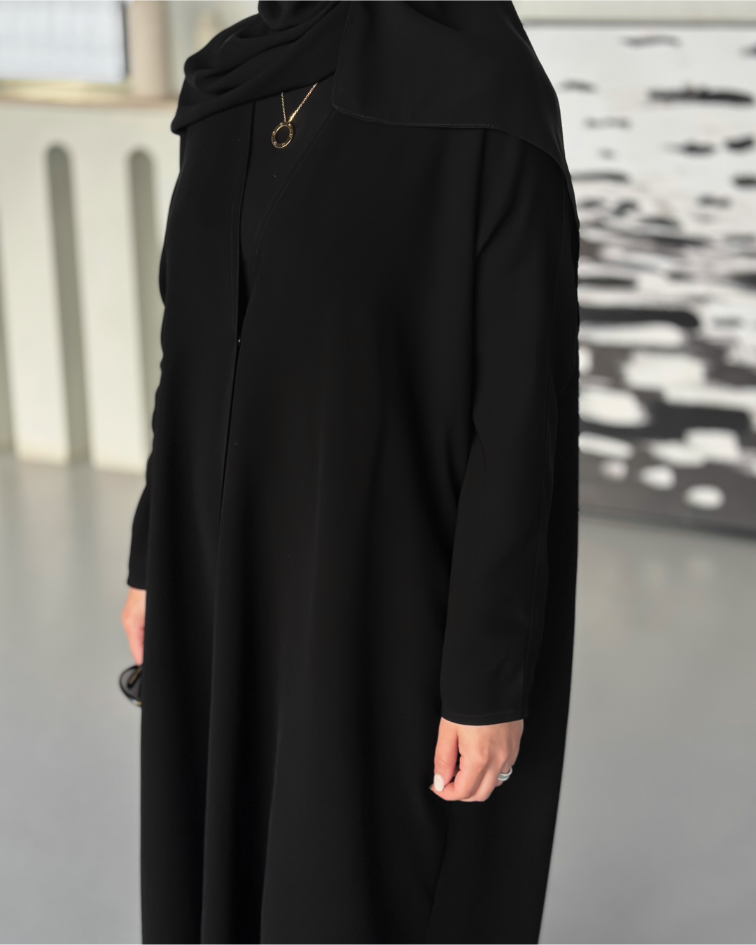 عباية سادة فري سايز قصتها نص جاينيز بخام الكريب الكوري فيها طباقي واحد من تريد الطباقي الكامل او تكون مفتوحة بدون طباقي تكتب بالملاحظات